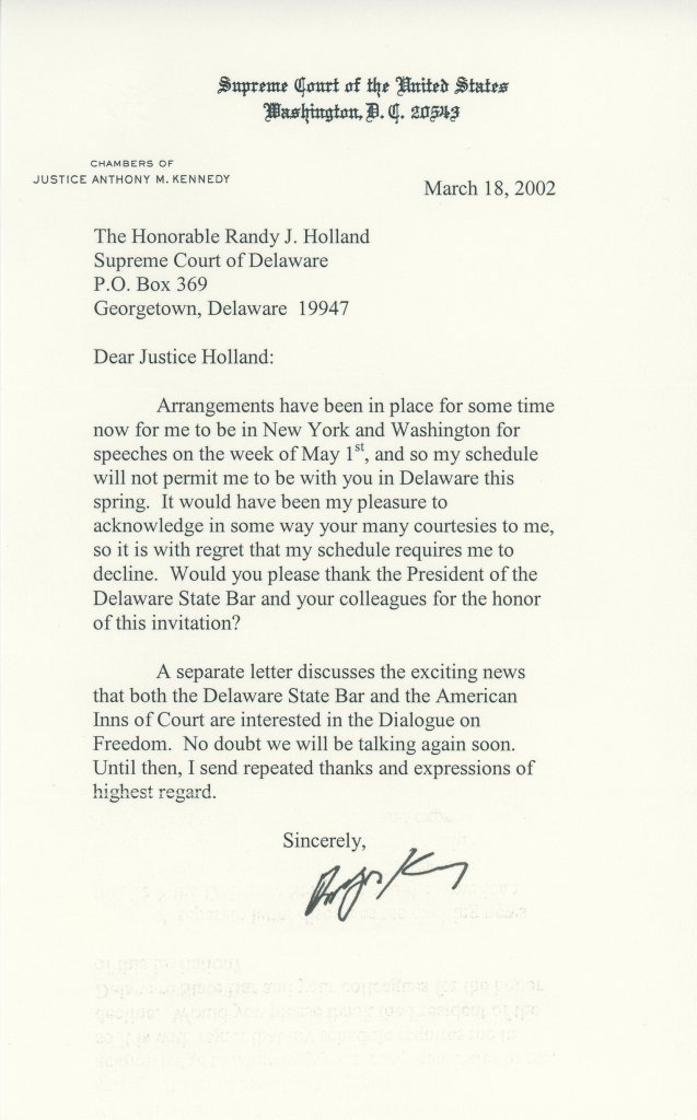A separate letter discusses the exciting news that both the Delaware State Bar and the American Inns of Court are interested in the Dialogue on Freedom. No doubt we will be talking again soon. Until then, I send repeated thanks and expressions of highest regard.