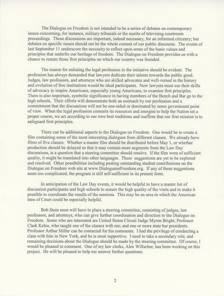 Bob Stein soon will have in place a steering committee, consisting of judges, law professors, and attorneys, who can give further coordination and direction to the Dialogue on Freedom. Some who are interested are United States Circuit Judge Myron Bright; Professor Clark Kelso, who taught one of the classes with me; and one or more state bar presidents. Professor Arthur Miller can be contacted for his comments. I had the privilege of conducting a class with him in New York, and he is most supportive. I need to take a secondary role, and remaining decisions about the Dialogue should be made by the steering committee. Of course, I would be pleased to comment. One of my law clerks, Alex Willscher, has been working on this project. He will be pleased to help me answer further questions.