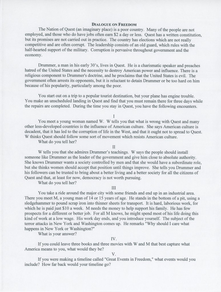 The Dialogue on Freedom is open to refinements and improvements, but for now it has a rather simple outline. The plan is for judges, law professors, and attorneys to visit high school students on Law Day. A skilled and experienced instructor can conduct the class by him or herself, but my recommendation is that a team of two or three members of the Bench and Bar visit each high school class. To give the dialogues a common theme, we have prepared a case study, which should be given to students a few days in advance of the class. The hypothetical asks the students to engage in a series of conversations in the nation of Quest. Parts I through III of the hypothetical set forth the basic framework for the dialogue. My own experience has been that Part I alone can sustain an hour and a half of excellent discussion. Parts II and III may lead to a discussion of sensitive issues concerning how other countries view American foreign policy and whether our policies are sufficient to answer those concerns. Even though broader issues of our mission and purpose in global affairs, rather than specific policies, should be the emphasis of the Dialogue on Freedom, this line of discussion can prove most constructive. As a member of the Third Branch of the national government, I must be somewhat cautious in this particular area; but other participants and members of the Bar likely will not be so constrained.