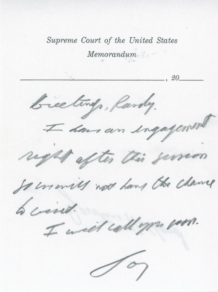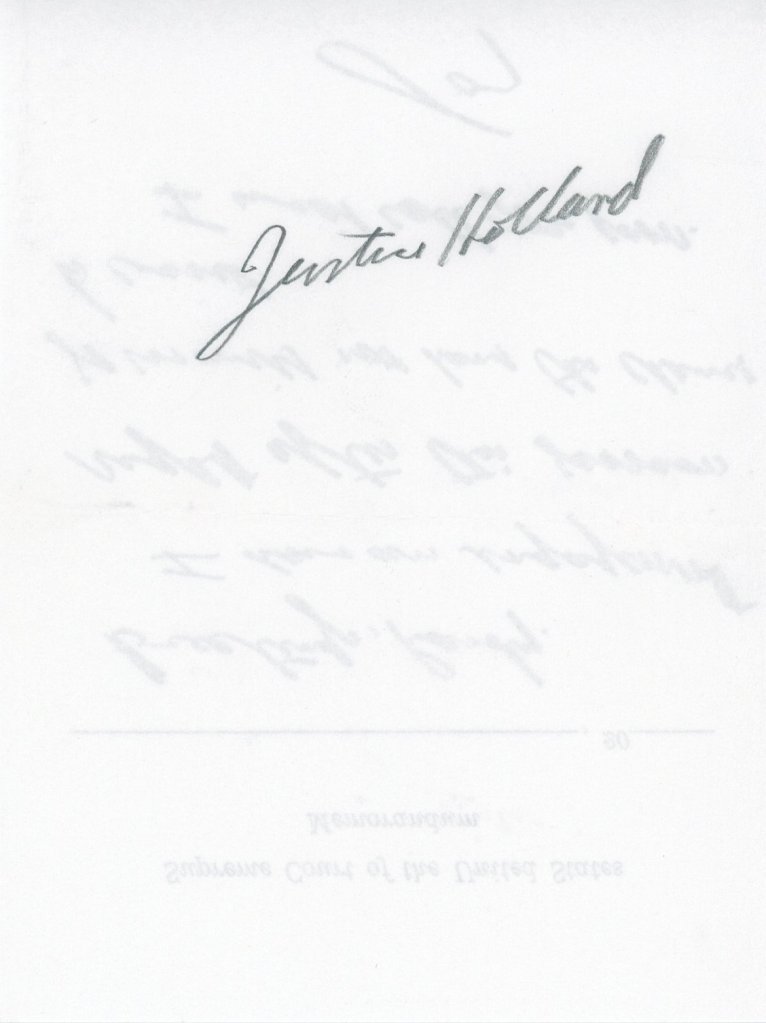 A hand-written note from Justice Anthony Kennedy to Justice Randy Holland from June 17, 2002. During a visit to admit an applicant to the U.S. Supreme Court Bar. If anyone knows which lawyer this might have been, please send a message or leave a comment.