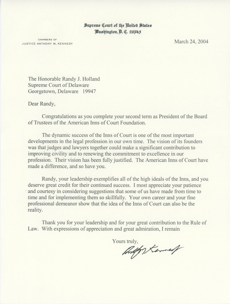For those of us outside the legal profession, the popular media has emphasized a political agenda or split among the US Supreme Court Justices and among State Supreme Court Justices. However, this communication of Justice Kennedy to Justice Holland shows a need for and respect for the mission of the Inns of Court which in Justice Kennedy’s opinion was advanced nationally under Justice Holland’s leadership, making a difference in the respect for and devotion to the Rule of Law in the legal process of our Country. As evidenced by written communications with other US Justices, Justice Holland’s leadership crossed whatever political divide that exists to prevail in the devotion to the higher principles of the Rule of Law. And, this is a person who was as comfortable speaking with people of all walks of life as he was with Supreme Court Justices of the United States. His career had impacts throughout the Country, and indeed , thought out the world.
