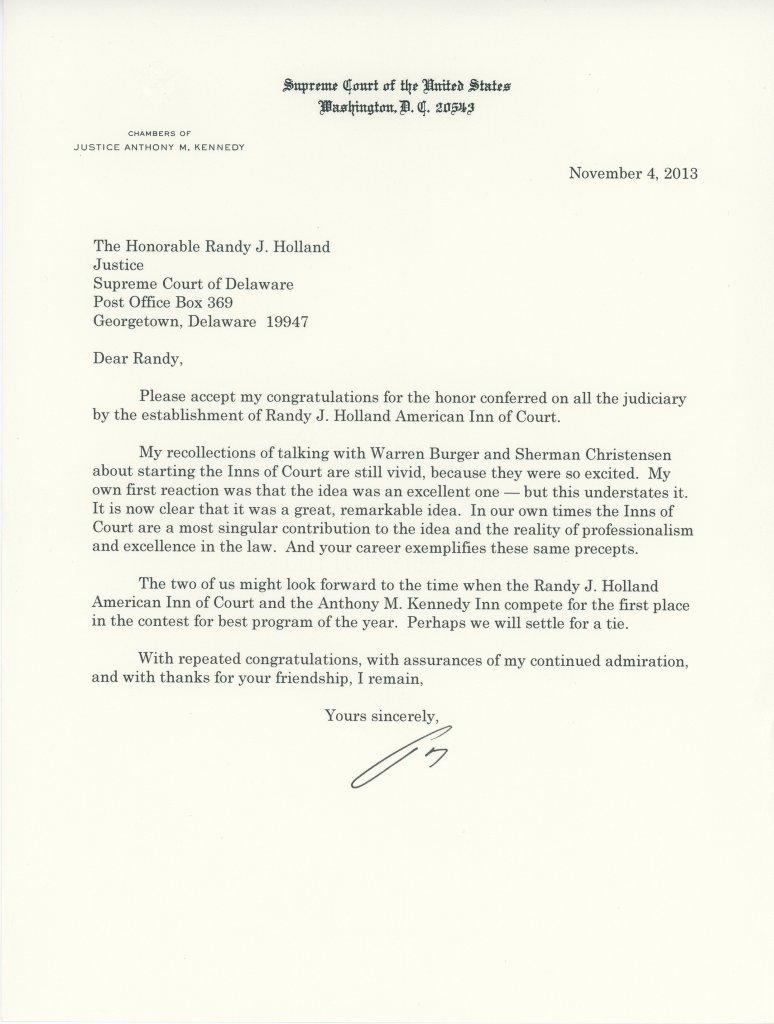Please accept my congratulations for the honor conferred on all the judiciary by the establishment of Randy J. Holland American Inn of Court.