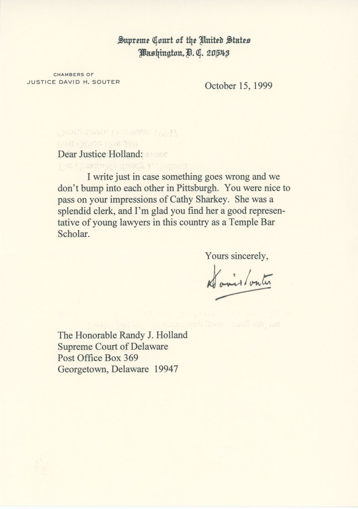 I write just in case something goes wrong and we don’t bump into each other in Pittsburgh. You were nice to pass on your impressions of Cathy Sharkey. She was a splendid clerk, and I’m glad you find her a good representative of young lawyers in this country as a Temple Bar Scholar.