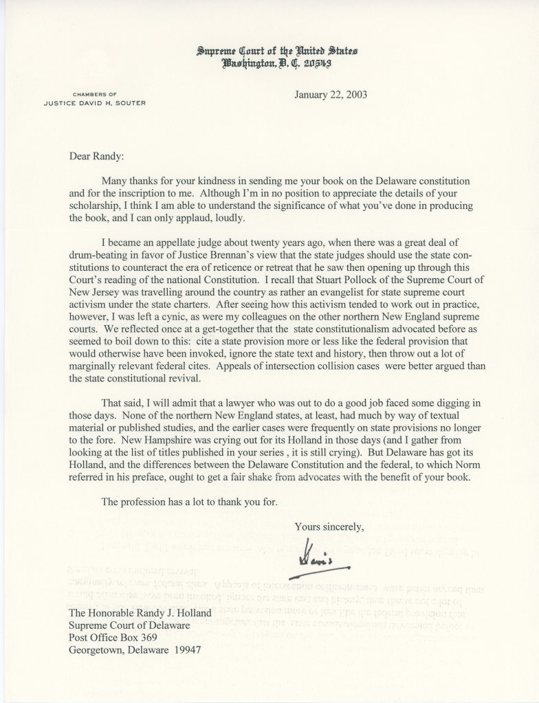 That said, I will admit that a lawyer who was out to do a good job faced some digging in those days. None of the northern New England states, at least, had much by way of textual material or published studies, and the earlier cases were frequently on state provisions no longer to the fore. New Hampshire was crying out for its Holland in those days (and I gather from looking at the list of titles published in your series, it is still crying). But Delaware has got its Holland, and the differences between the Delaware Constitution and the federal, to which Norm referred in his preface, ought to get a fair shake from advocates with the benefit of your book.
