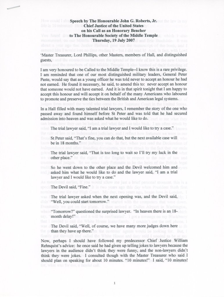 Perhaps I should have heeded my predecessor Chief Justice William Rehnquist’s advice: he once mentioned he had given up telling jokes to lawyers because the lawyers in the audience didn’t think they were funny, and the non-lawyers didn’t think they were jokes. However, I consulted with the Master Treasurer who advised I should plan on speaking for about 10 minutes. “10 minutes!” I exclaimed, “10 minutes!”