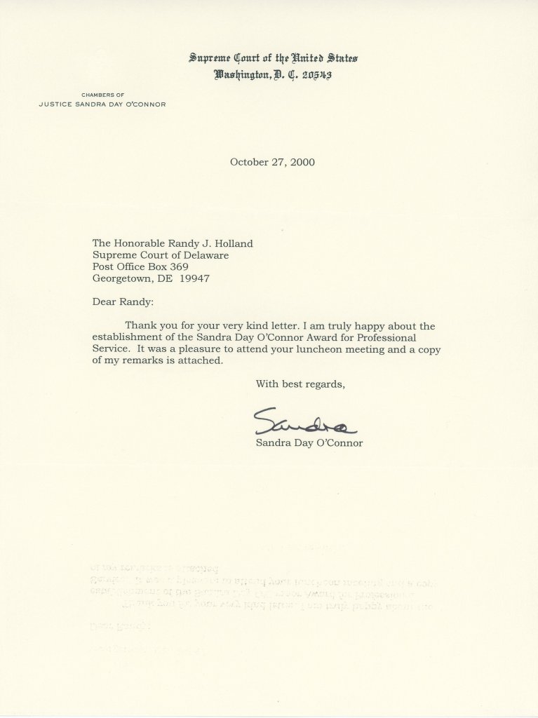Thank you for your very kind letter. I am truly happy about the establishment of the Sandra Day O’Connor Award for Professional Service. It was a pleasure to attend your luncheon meeting and a copy of my remarks is attached.