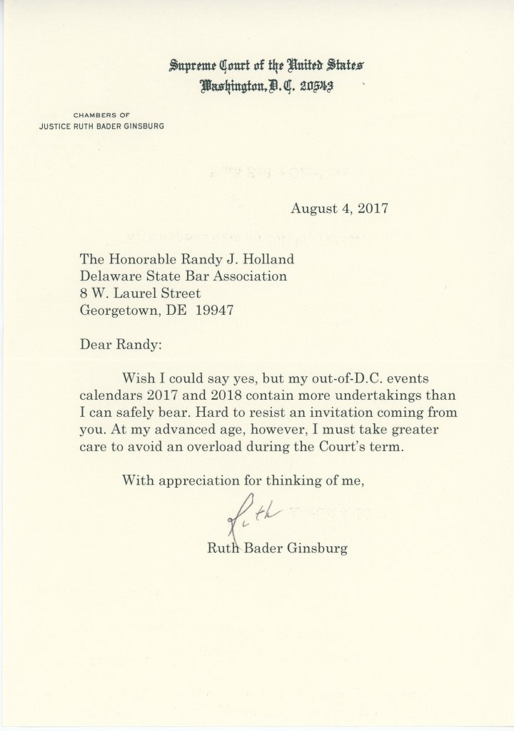 Georgetown, DE 19947Categories: Justice GinsburgTags: 2017, august, delaware, judge, judicial, judiciary, justiceginsburg, law, lawyer, legal, Letters, note, notoriousrbg, randyholland, randyjolland, rbg, ruthbaderginsburg, ruthginsburg, scotus, supremecourt -