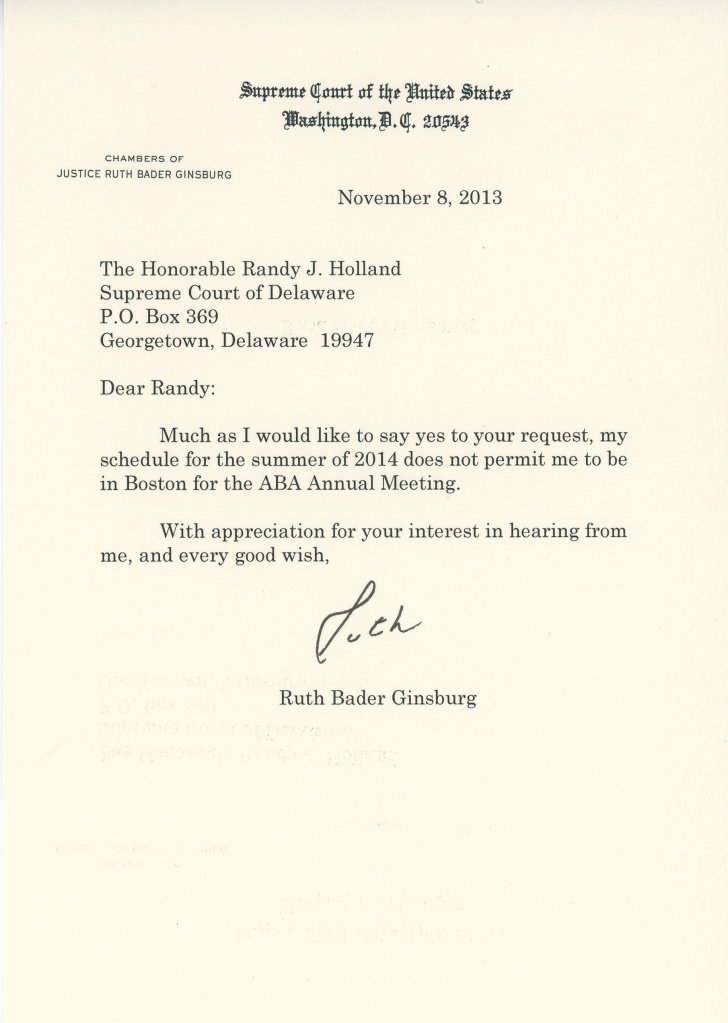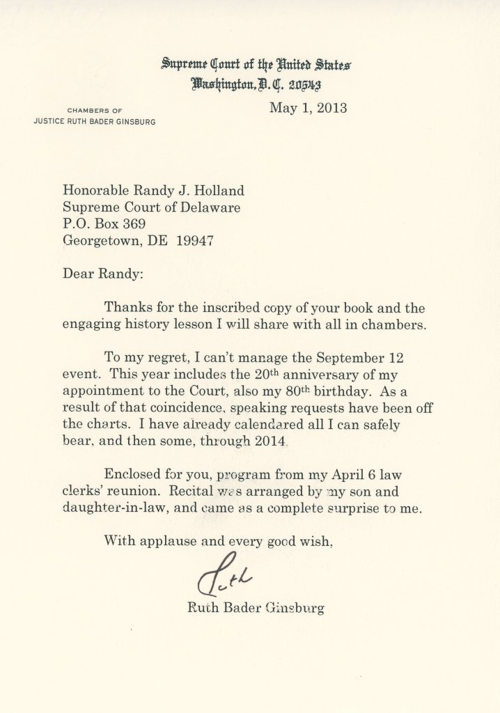 Letter from Justice Ruth Bader Ginsburg to Randy J. Holland re Holland Inn of Court Naming– Oct 30, 2013