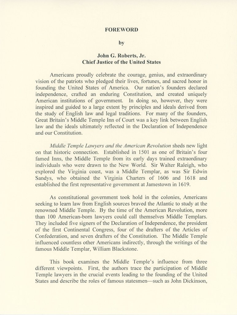 Forward by Justice John Roberts for Middle Temple and the American Revolution Book