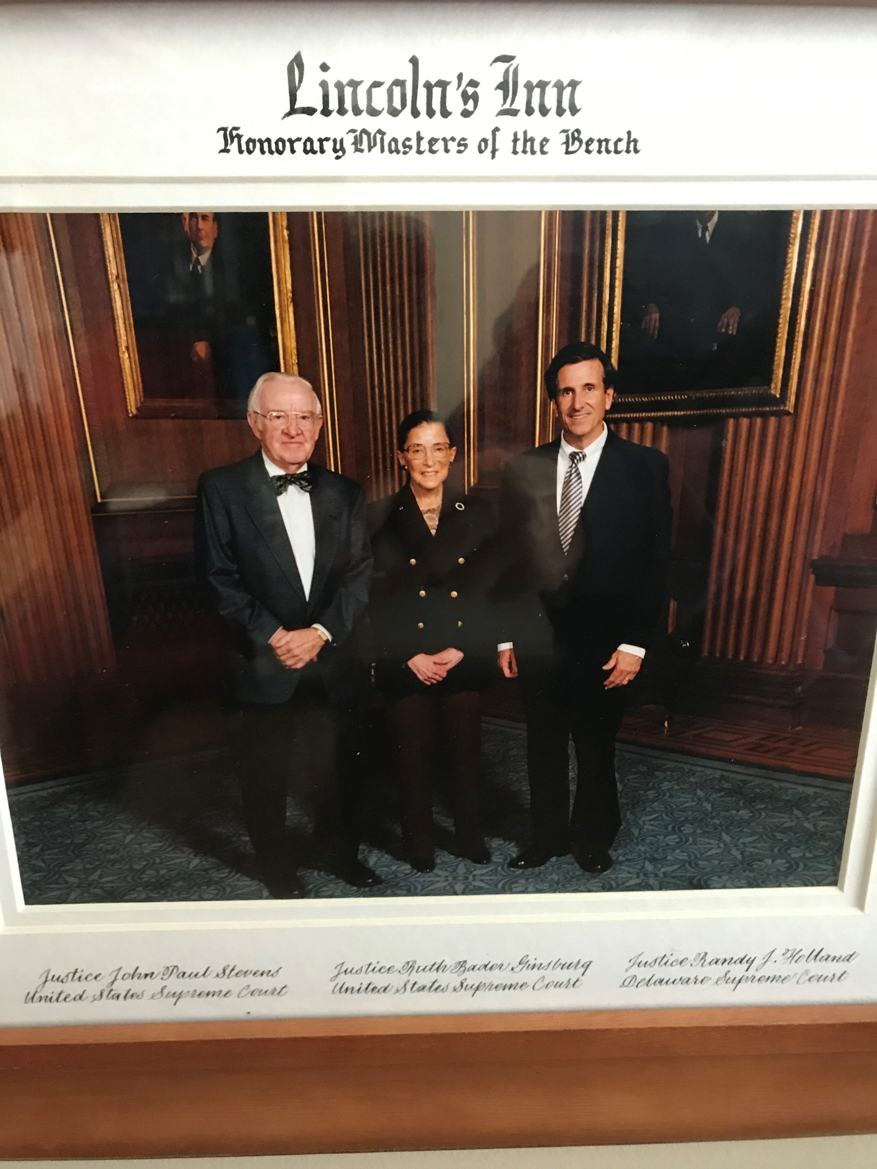 Justice John Paul Stevens, Justice Ruth Bader Ginsburg, Justice Randy J. Holland – The only three Americans named as honorary Masters of the Bench Justice Holland was active internationally. He was the only state judge on a nine-person Anglo-American Exchange that included United States Supreme Court Justices Breyer and Scalia. For over a decade, he worked with the Chief Justice of Taiwan in training its judiciary about handling complex corporate and commercial litigation. For more than twelve years, he gave the keynote address to the Taiwan Corporate Governance Association (TCGA). He was elected as the first Distinguished Fellow of the TCGA Directors’ Academy. Justice Holland edited a Chinese-language casebook on Delaware Corporation Law published only in Taiwan. In 2019, a book of his speeches in Taiwan on corporate law was published in Chinese.