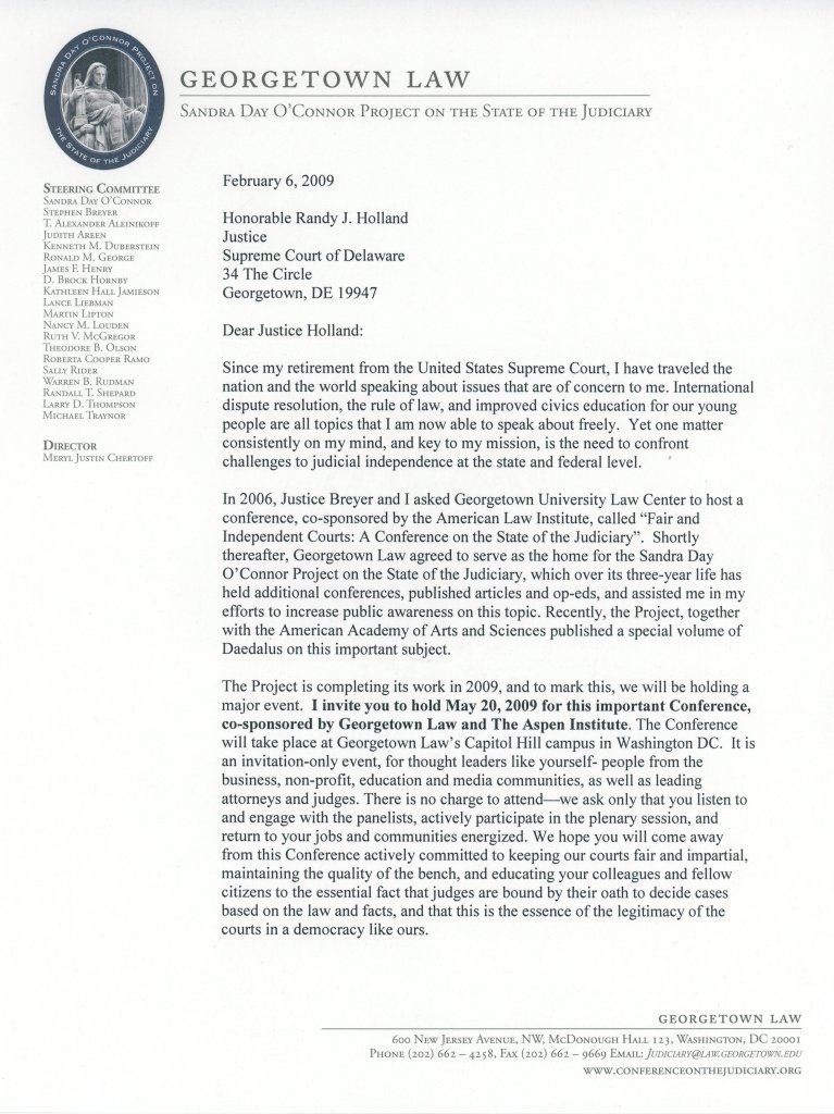 Letter from Justice Sandra Day O’Connor to Justice Randy J. Holland: February 6, 2009