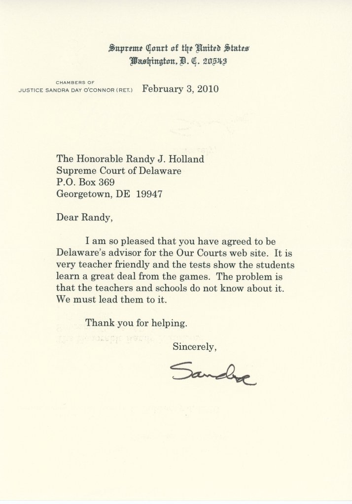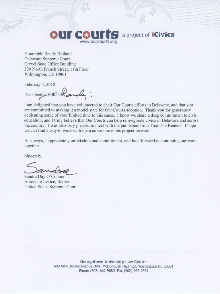 I am delighted that you have volunteered to chair Our Courts efforts in Delaware, and that you are committed to making it a model state for Our Courts adoption. Thank you for generously dedicating some of your limited time to this cause. I know we share a deep commitment to civic education, and I truly believe that Our Courts can help reinvigorate civics in Delaware and across the country. I was also very pleased to meet with the publishers from Thomson Reuters. I hope we can find a way to work with them as we move this project forward.